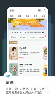 悬疑、女性、幻想、文艺、历史五大频道,拥有豆瓣评分8.0以上的优质小说,经过豆瓣读者数据检验。