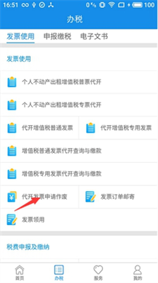 3、点击税务,直接选择发票用途、申报付款或电子文件。
