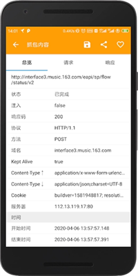 支持浏览一个网络请求的总体概况,包括URL、HTTP协议、HTTP方法、响应码、服务器Host、服务器IP和端口、Content-Type、Keep-Alive、时间信息、数据大小信息等。
