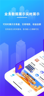 可实时展示交易量、交易笔数、金额,支持自定义时间查询,各功能入口清晰可见。