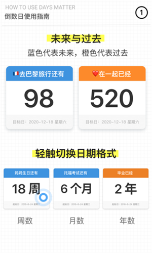 1、万年支持:支持从公元元年1月1日到公元9999年12月31日的倒数/正数日期,你可以计算诸如美国独立多少日、与女朋友交往多少日、宝宝出生多少日……