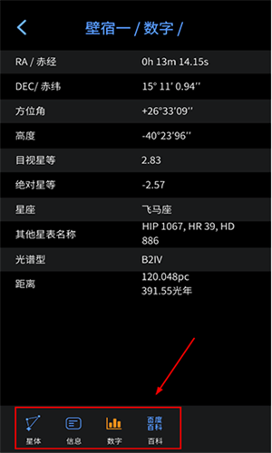 3、关注太阳以及其他行星的动向,在软件中点击某个行星就能知道当前它与自己的相对方向;
