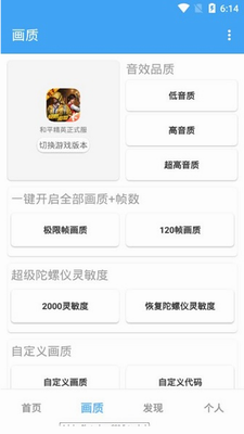 4、退出画质助手可以在底栏中选择“发现”,这里为和平精英和王者荣耀都提供了非常多的辅助,都是免费的;