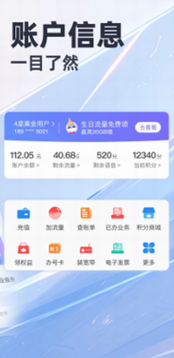 2、基础功能:话费查询、流量查询、账单查询、交费充值、积分查询兑换、业务办理等。