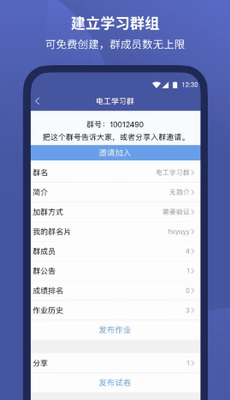 1、可以设置群组,邀请自己的好友或者学生加入,在群组中可以发布试卷作业。