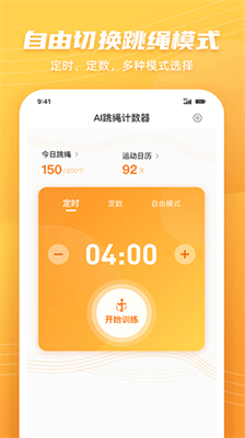 4、你可以选择是定时、定数还是自由模式跳绳,运动量可以根据自己的需求进行设置,增加你的跳绳兴趣,一起坚持跳绳运动!