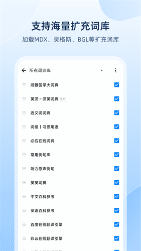 欧路词典下载安装免费是一款极为专业的英语字典应用,集词典、听力和翻译等功能于一身,不仅词典库极大,并且能通过语音库让字典实现真人标准发音,识词取词便利,支持多种语言,包括德语、西班牙语、法语和英语等,可以自定学习计划,协助用户更好的进行单词复习或者学习。