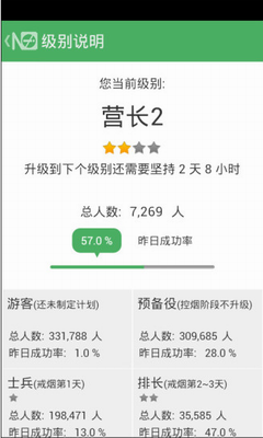 根据戒烟时间升级级别,全军事化规则,让戒烟更具成就感,当你烟瘾来袭时,多种克服烟瘾小方法帮助你顺利度过那5分钟,动态健康指数时时刻刻提醒你戒烟的好处,各种数据图表统计,让数据说话,告诉你自己是多么强大