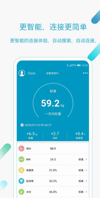 1.通过蓝牙4.0连接手机,不但显示体重根据您提供的身高自动计算出BMI数值及健康状况.每天点滴记录,时刻关注您的体形