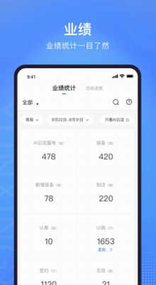 5)行销总监/经理实时外拓业绩追踪,同步内场客户状态,团队及个人业绩排行一目了然;