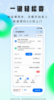 - 菜鸟裹裹:足不出户就能轻松寄包裹,一键呼叫快递员,2小时上门服务;同时支持淘宝、天猫、闲鱼运费险商品免费退货,购物达人们从此任性买无忧退。