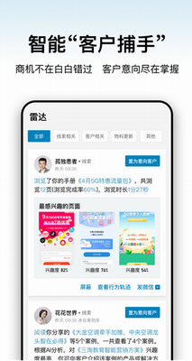 区分管理线索和客户;即时和客户聊天,聊天内容标注已读未读,确保跟进质量。